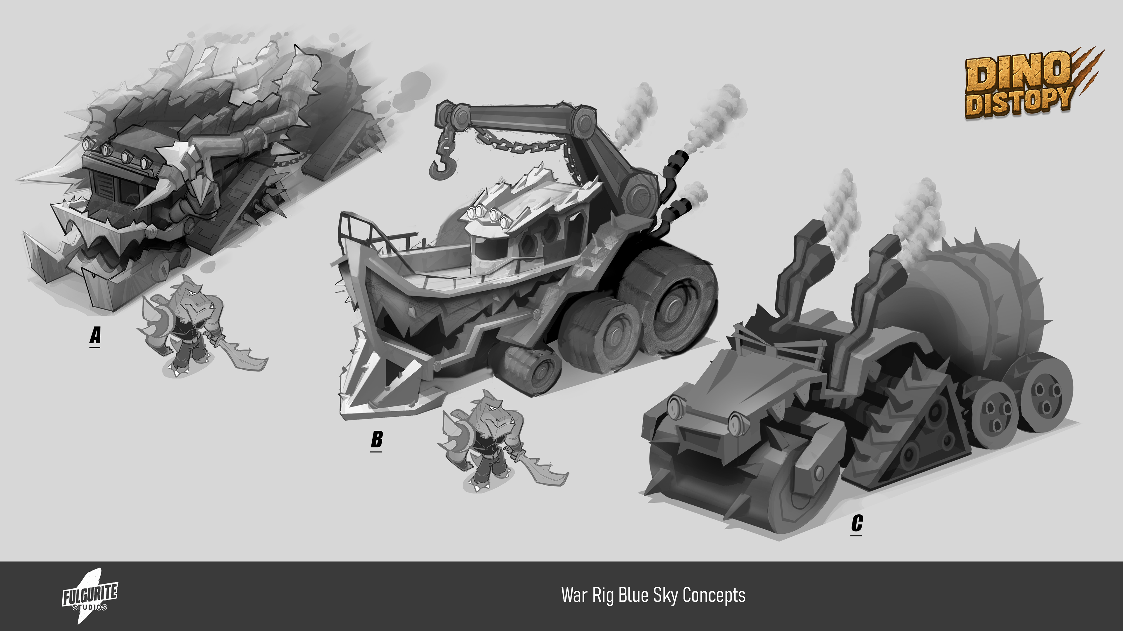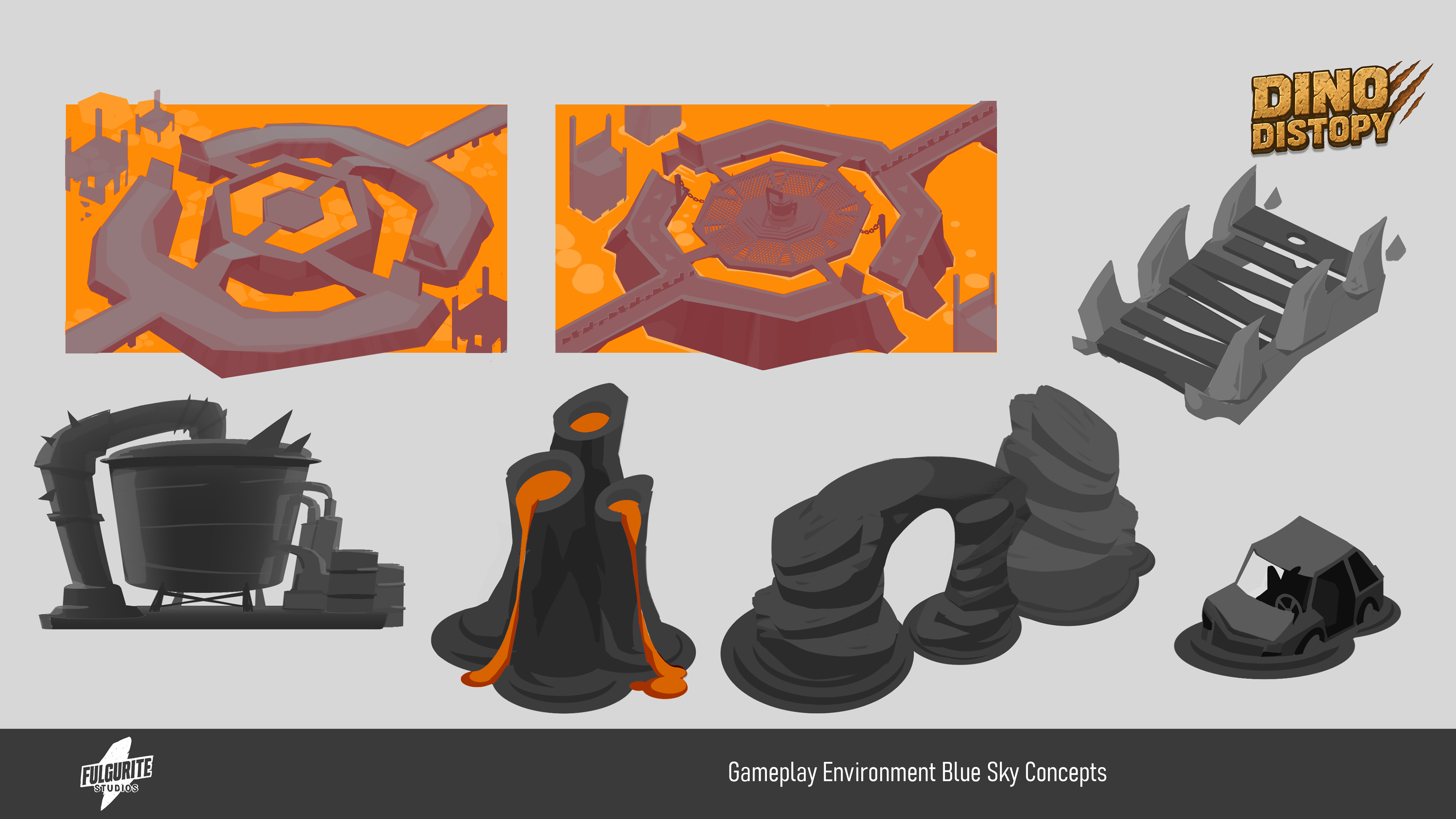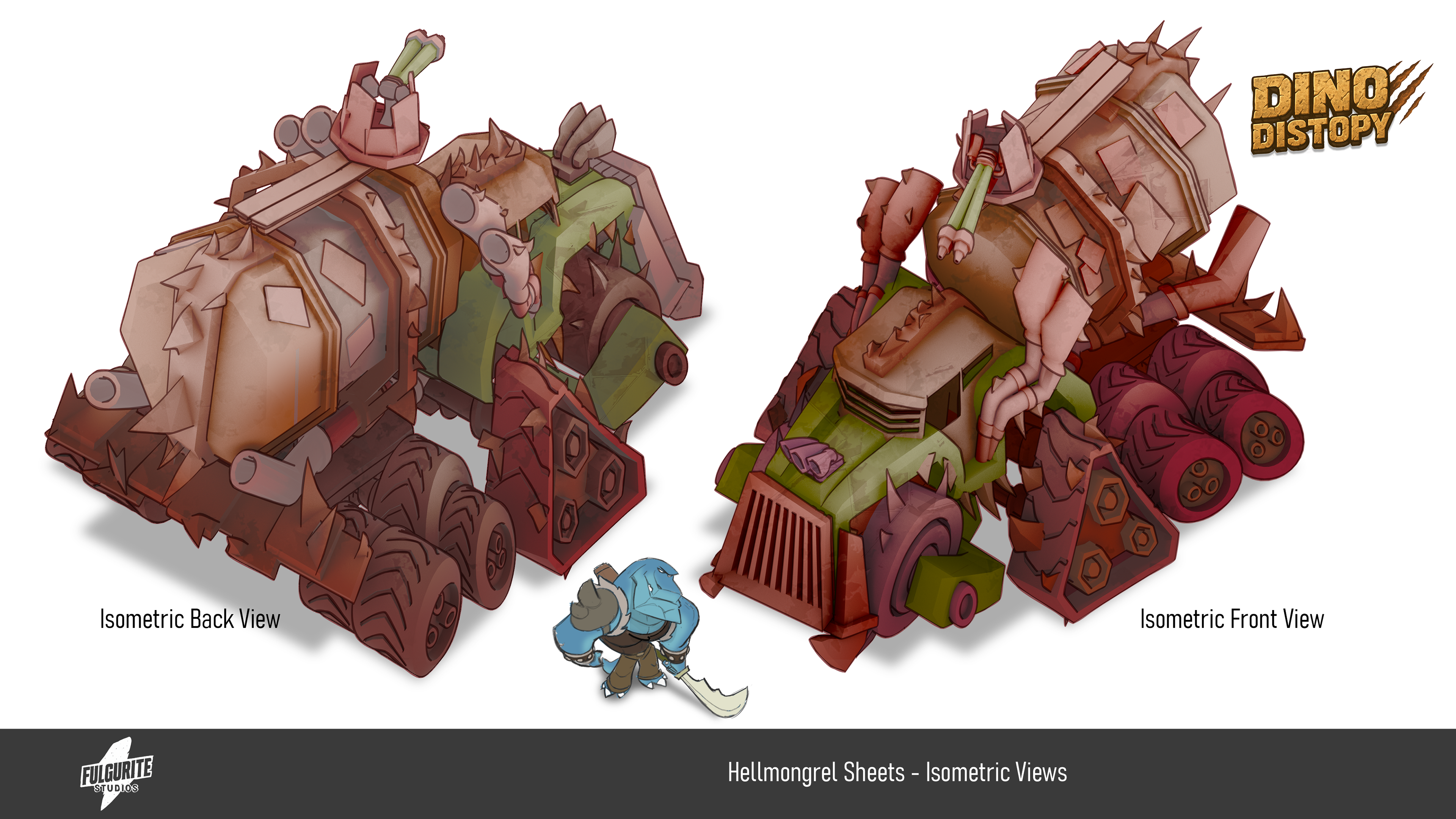 Dino Distopy Project - visual development & world building. This section brings together a selection of artworks created throughout the development of my fictional mobile game project, Dino Distopy, designed specifically to guide my students during the final project classes of my course Art and Design for Mobile Games. Dino Distopy is an isometric MOBA set in a post-apocalyptic world where anthropomorphic dinosaur warriors fight for survival amid landscapes devastated by global cataclysms. Blending a junkpunk aesthetic with the energy of a mobile party game, the project combines action, humor, strategy, and chaos in a setting inspired by Mad Max, where every territory, vehicle, and hero carries its own story of resilience. More materials will be posted soon, but some concept arts, model sheets, and illustrations are already available here.